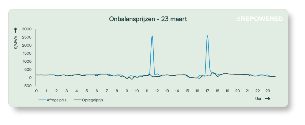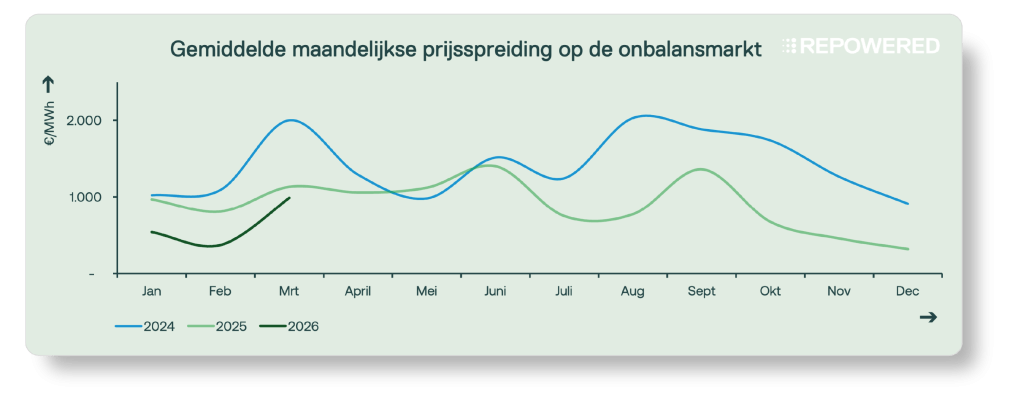 Maart 2026 was vergelijkbaar met maart 2025: de trend van dalende onbalansprijzen en lagere volatiliteit van afgelopen maanden zette niet door. Hoge gasprijzen zorgden voor dure opschakeling, terwijl de toename van zonne-energie en moeilijk voorspelbare windproductie de variabiliteit vergrootten. Door deze combinatie ontstonden op meerdere momenten hoge onbalansprijzen.