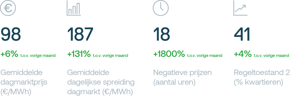 De gemiddelde dagelijkse prijsspreiding kwam uit op €187/MWh. Batterijen konden hier effectief op inspelen door overschotten van zonne-energie rond het middaguur op te slaan en terug te leveren tijdens de dure avonduren. Dagelijkse prijsverschillen boven de €200/MWh zijn uitzonderlijk, maar kwamen deze maand opvallend vaak voor: op ongeveer 15 dagen daalden de prijzen rond het middaguur tot nul om vervolgens te stijgen tot boven de €200/MWh. Ter vergelijking: in maart 2025 gebeurde dit slechts op drie dagen.