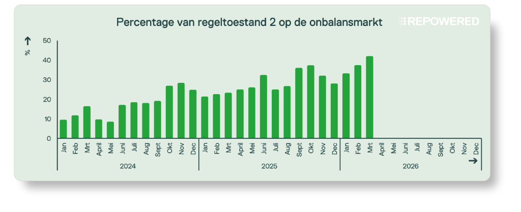 Het aandeel regeltoestand 2 bereikte deze maand een nieuw record: 41% van de kwartieren eindigde in regeltoestand 2. Meerdere momenten combineerden extreme prijzen met regeltoestand 2, wat een groot risico kan vormen voor marktdeelnemers met veel onbalans. Een duidelijk voorbeeld was 23 maart, toen het systeem twee keer in regeltoestand 2 terechtkwam tijdens periodes van zeer hoge onbalansprijzen van €2.500/MWh.