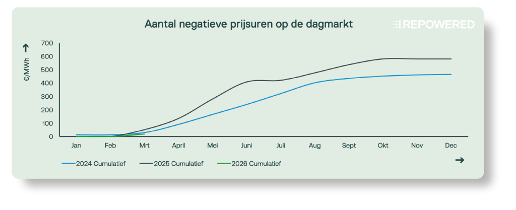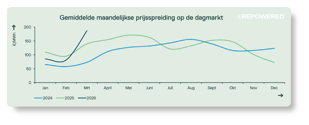 Deze eerste maand van het jaar met serieuze zonneproductie geeft een duidelijk beeld van wat we de komende periode kunnen verwachten. Als de spanningen in het Midden-Oosten aanhouden en de gasprijzen verder stijgen, is de verwachting dat de prijsverschillen binnen een dag verder toenemen.