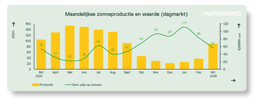 De productie van zonne-energie nam in maart sterk toe, met meer dan een verdubbeling ten opzichte van februari. Regelmatig zonnig weer met weinig bewolking zorgde voor een ruim aanbod en drukte de elektriciteitsprijzen omlaag. Tegelijkertijd leidden stijgende spanningen in het Midden-Oosten tot hogere gasprijzen. Wanneer gascentrales het overnamen van zonne-energie, resulteerde dit in grote prijsverschillen binnen de dag.