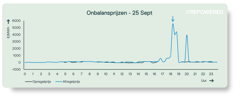 In september waren er meerdere ISP’s met extreme prijzen voor opregelen zonder regeltoestand 2. Hierdoor leverde het op het juiste moment ontladen met een batterij veel op. Zo was op 21 september de prijs twee kwartieren 3.970 €/MWh. Op 25 september was dit zelfs 5.550 €/MWh: een nieuw record!