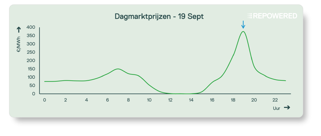 Op drie momenten deze maand overschreden de avondprijzen 300 €/MWh, met de hoogste piek op 19 september. Na een zonnige dag steeg de prijs van €0 om 14:00 uur naar 374 €/MWh om 19:00 uur.