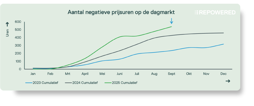 Het totaal aantal negatieve prijsuren blijft toenemen, ook bij de overgang naar de herfst, en overtreft de records van voorgaande jaren. Eind september staat de teller van dit jaar op 538 uren met negatieve prijzen.