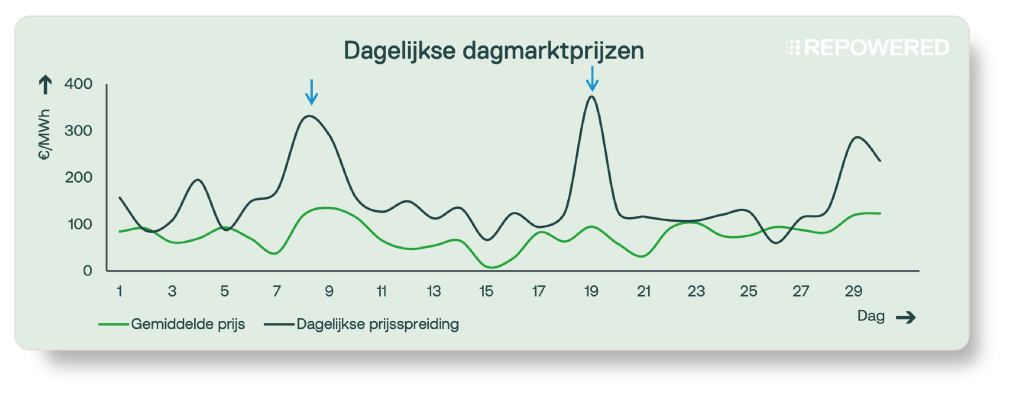 De dagelijkse prijsspreiding is het verschil tussen de hoogste en laagste uurprijs op één dag. Bij een grote spreiding is het verdienpotentieel van batterijen hoog, want er kan dan goedkoop elektriciteit worden gekocht (laden), en dure elektriciteit worden verkocht (ontladen).
