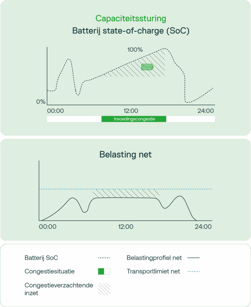 Een goed voorbeeld is een batterij: er wordt met de netbeheerder afgesproken de batterij op te laden op momenten dat er te veel opwek is in een congestiegebied, of juist te ontladen wanneer er te veel elektriciteit wordt afgenomen. Met onze slimme aansturing zorgen wij ervoor dat de batterij op het juiste moment volledig is opgeladen en dat je een passende vergoeding van de netbeheerder ontvangt.