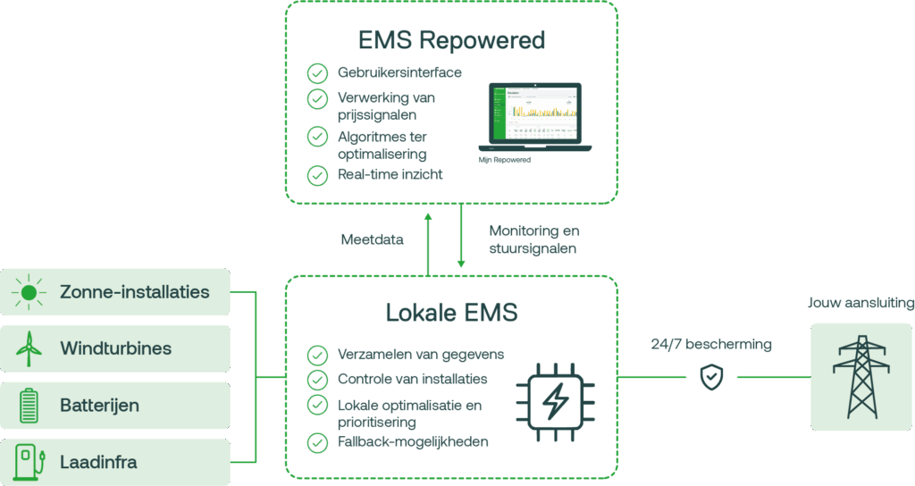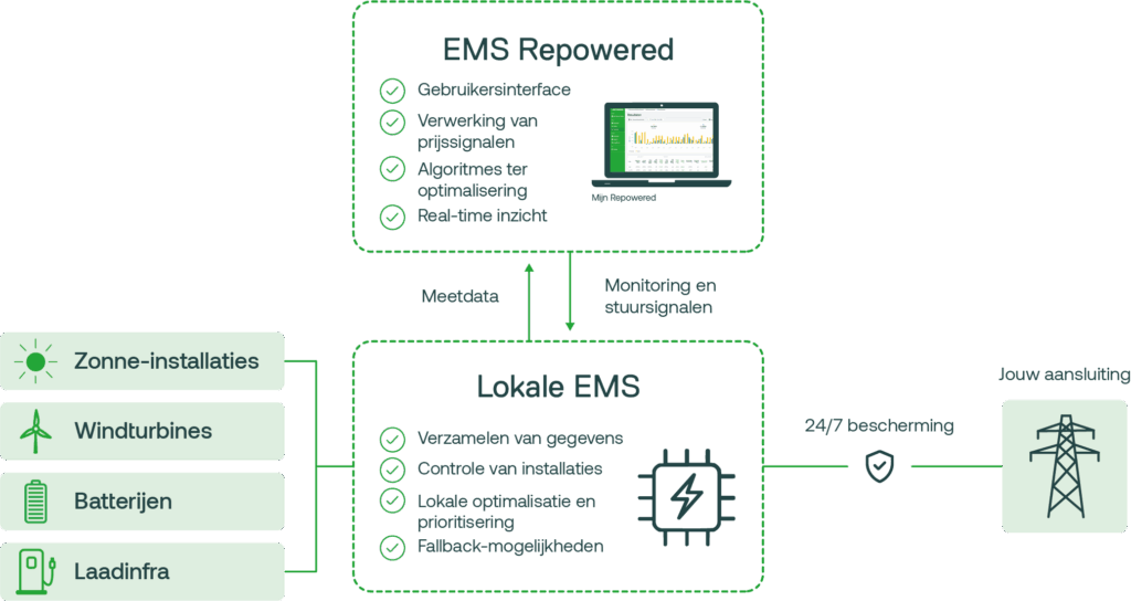 Er zijn verschillende soorten EMS-systemen: een lokaal EMS en Repowered’s EMS. Een lokale EMS meet, analyseert en optimaliseert het energieverbruik van je gebouw en installaties. Repowered’s EMS is het platform waarop wij slimme optimalisatie uitvoeren en de koppeling maken met verschillende energiemarkten. Ons systeem is volledig compatibel met lokale EMS’en. De lokale EMS staat altijd verbonden met internet, zodat wij je installaties slim kunnen aansturen.